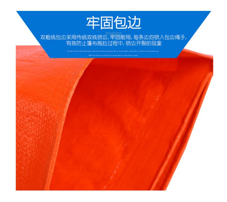 雙桔色PE防水篷布牢固包邊,雙粗線包邊采用傳統(tǒng)雙線鎖邊,牢固耐用,每條邊均鎖入包邊繩子,有效防止篷布拖拉過(guò)程中鎖邊開裂的現(xiàn)象